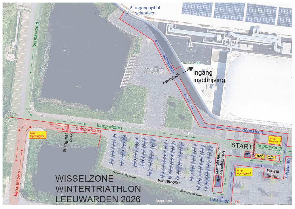 De wisselzone is tegelijk ook de fietsenstalling; deze wordt bewaakt en daar mogen alleen maar de deelnemers in op vertoning van hun startnummer!